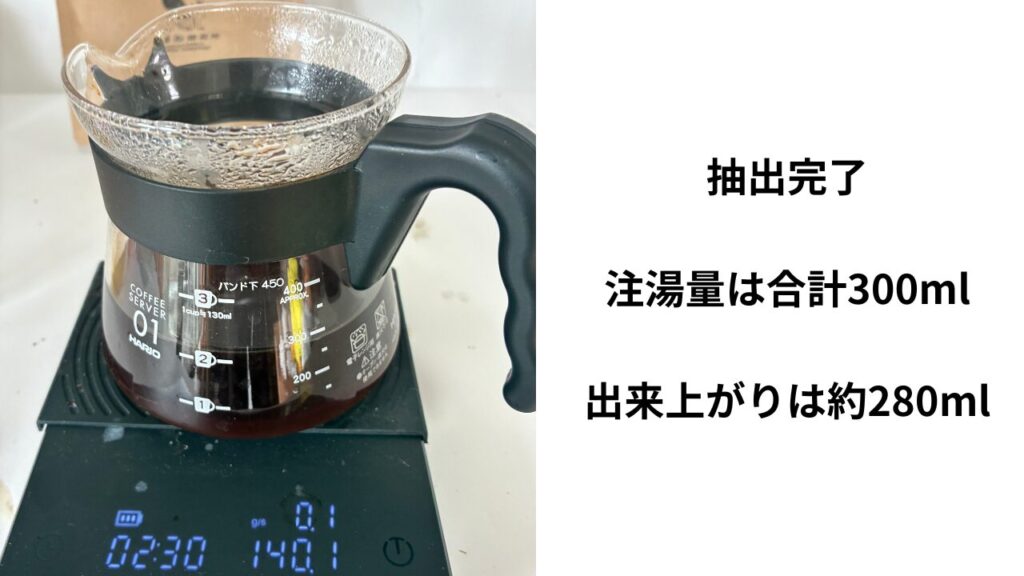 - コーヒー豆12gに対して湯量180mlを注ぎ、出来あがりは約150ml。