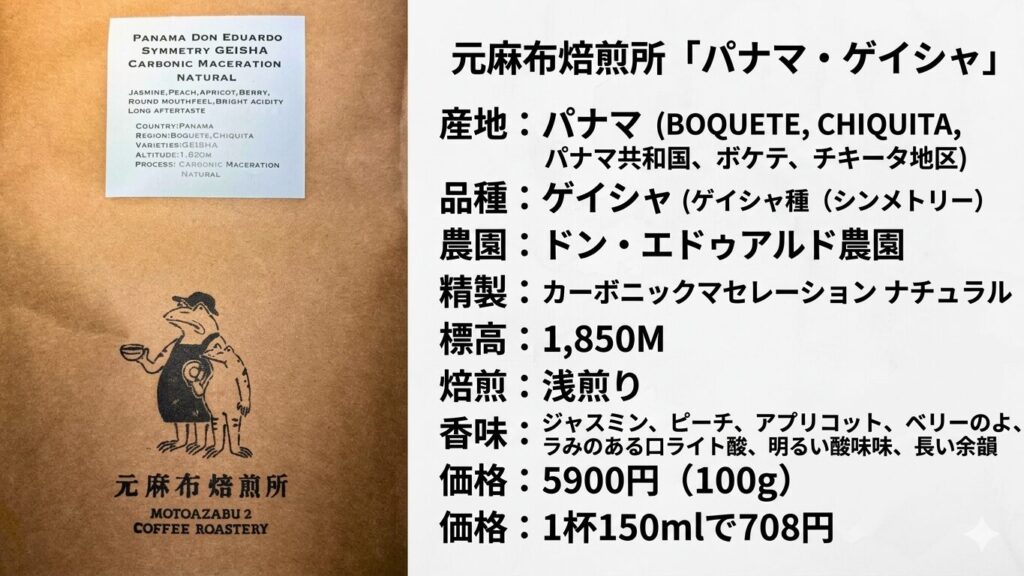 元麻布焙煎所のパナマ・ゲイシャ(カーボニックマセレーション)の価格は100gで5,900円。