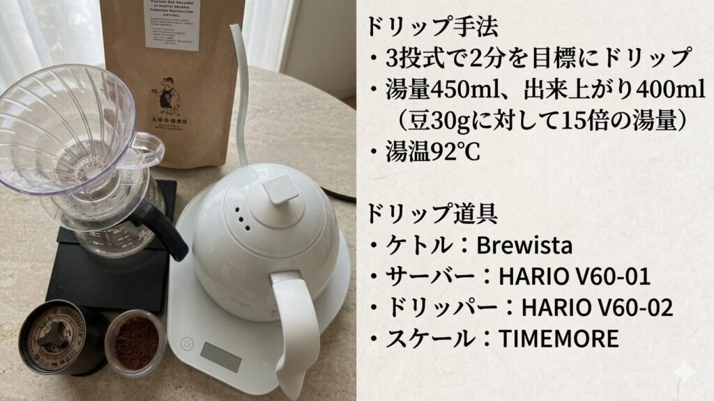 ゲイシャの華やかさと甘みを引き出すため、3投式のハンドドリップで淹れました。4:6メソッドよりも少ない投数で、高めの温度(92度)でしっかり抽出するレシピです。