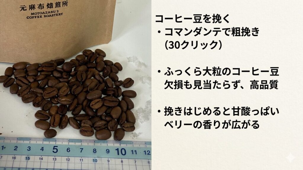 挽き始めの段階で甘酸っぱいベリーの香りが広がり、期待が高まります。豆はやや硬めで、コマンダンテで挽くと少し引っかかる感触がありました。挽いた後の粉からは明るく甘い香りが漂います。