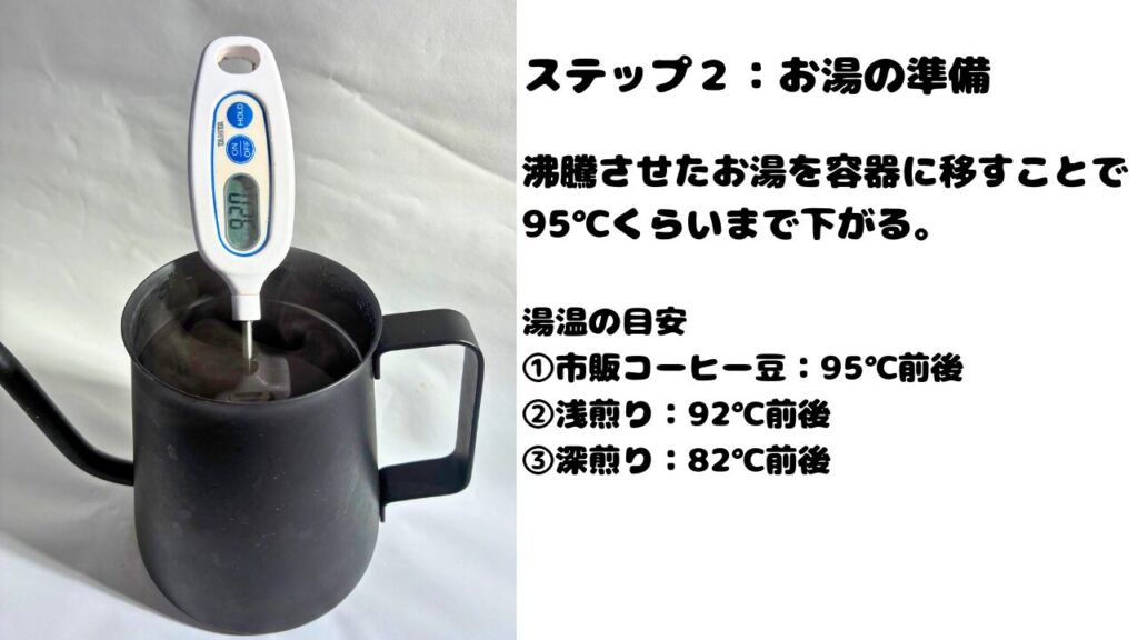 お湯を沸騰(100℃)させたあと、一度別の容器に移すことで95℃くらいまで下がります。