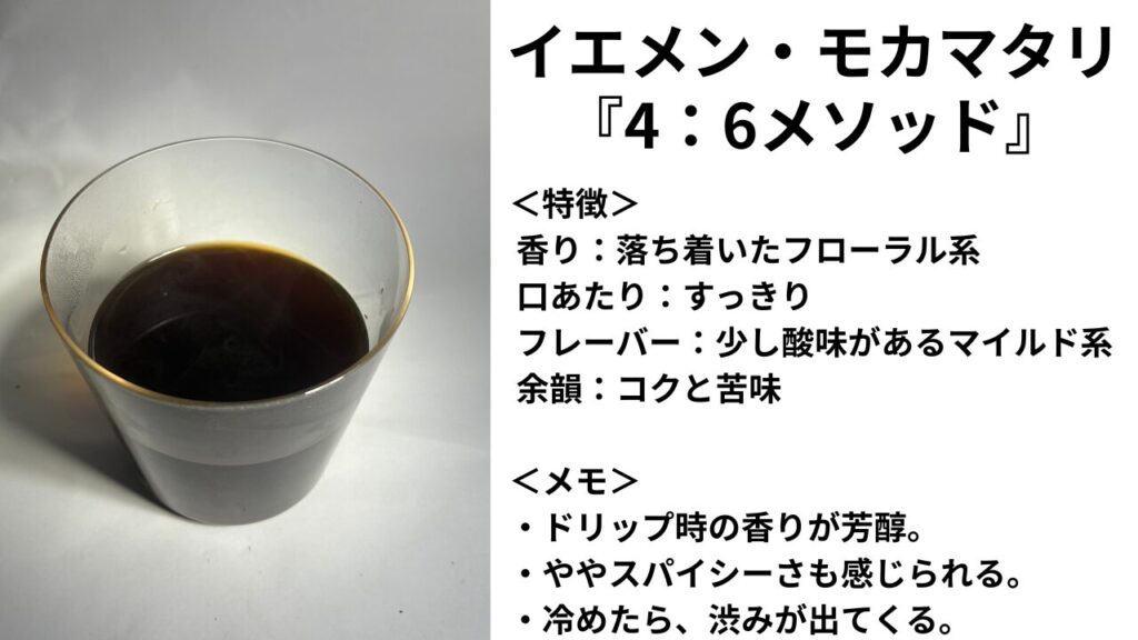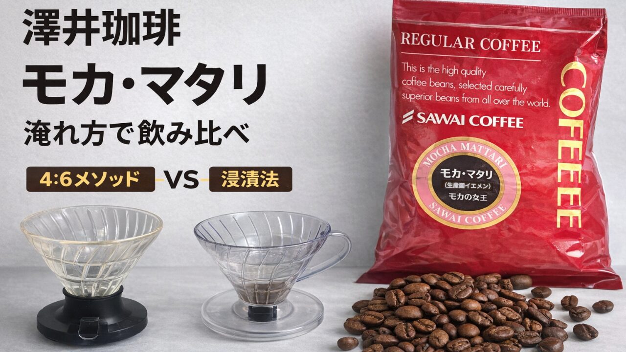 今回は、澤井珈琲のコーヒー豆「モカマタリ」について、「4:6メソッド」と「浸漬ドリップ」の飲み比べをしました。