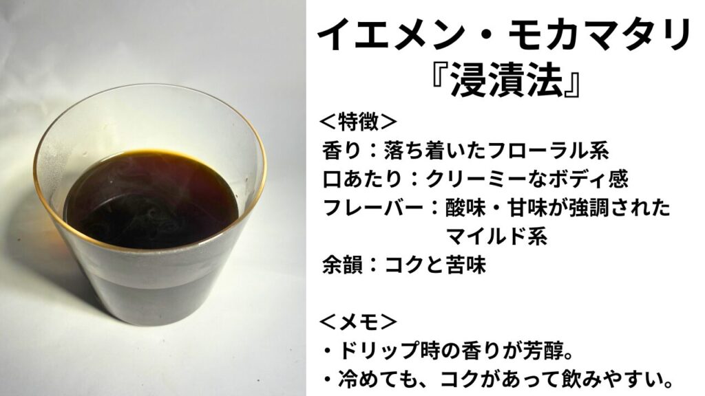 コーヒー豆を挽いた時やドリップ時のアロマは芳醇で、どちらのドリップも、モカマタリの「酸味とコクがあるバランスが取れたコーヒー」を楽しむことができました。個人的には、クリーミーさ・ボディ感が強くなり、冷えた後もバランスの良さを楽しめる「浸漬法」が好みでした。