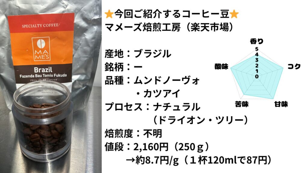 マメーズ焙煎工房のブラジル FUKUDA TOMIOの価格は250gで2160円。