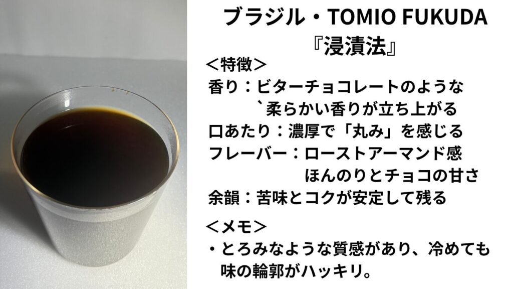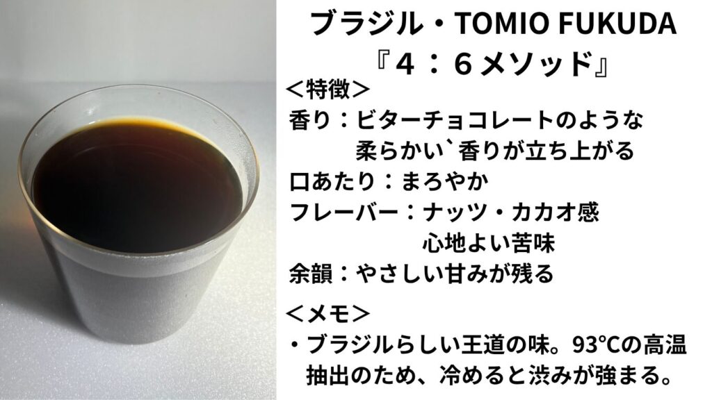 ブラジルらしい「ナッツとカカオ」が広がるコーヒーで、「4:6ドリップ」は口あたり良く飲むことがき、「浸漬法」はボディ感を強調した味わいを感じることができました。