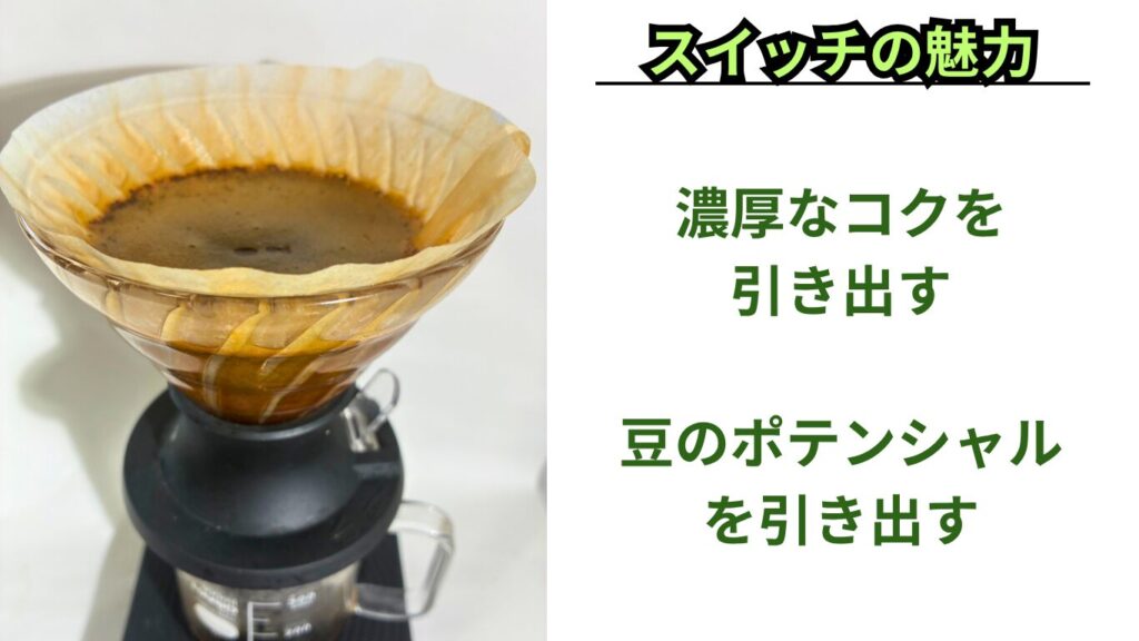 スイッチを使うことで、浸漬式ならではの安定感と、ネルドリップのような厚みのある抽出を両立できます。