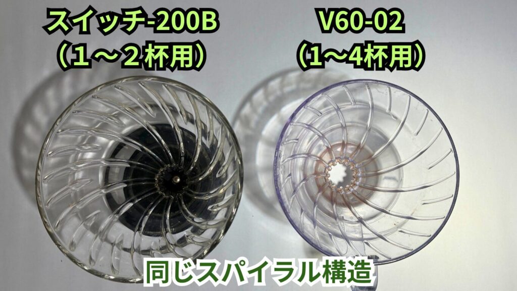 ドリッパーの構造はV60と同じ円すい形で流線型の内部リブ構造で設計されており、抽出時にお湯が粉全体に行き渡りやすい形状となっています。また、大きさは、HARIOのV60-02(1〜4杯分)とスイッチの200B(1〜2人分)が同じくらいのサイズです。